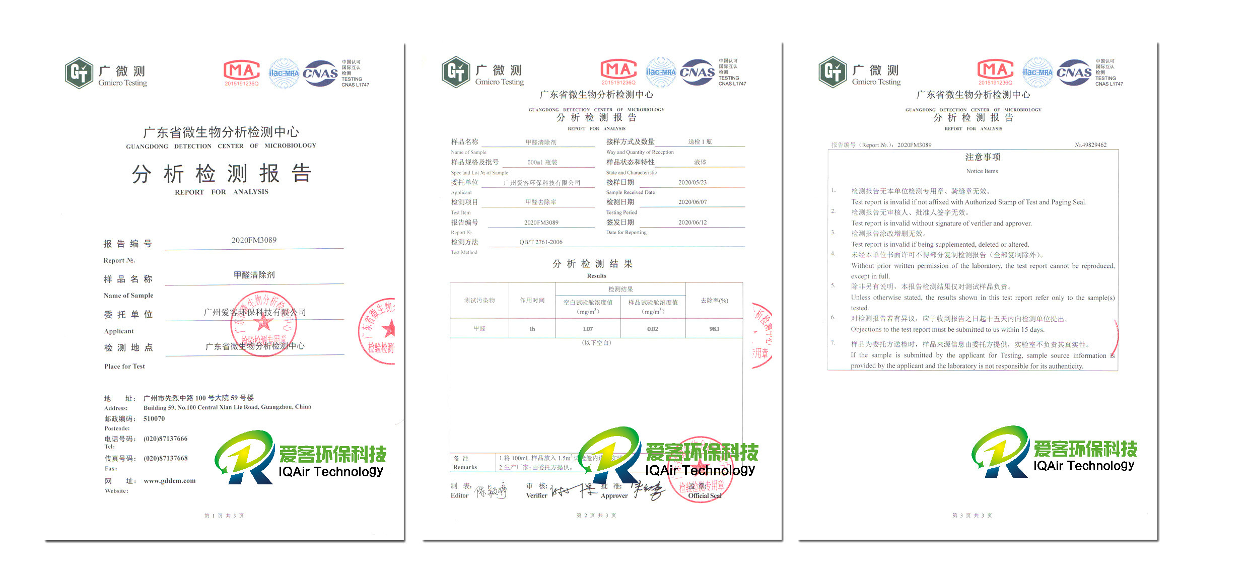 甲醛清除劑檢測報告